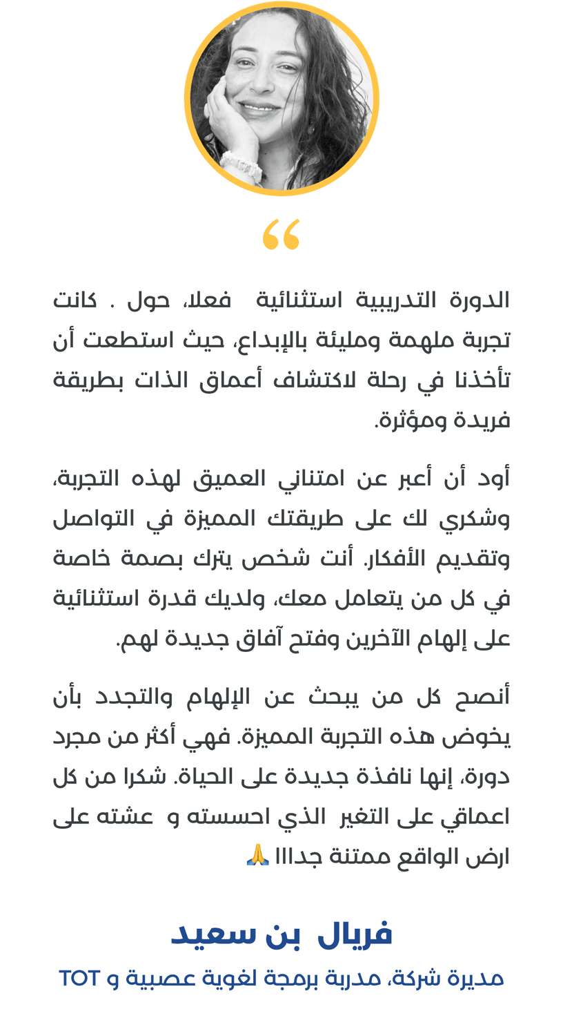 دعم أسبوعي جماعي مباشر من المدرب ولمدة 4 أشهر من تاريخ الاشتراك، لتثبيت وتعزيز تحكمك في شخصيتك حتى تحترف تطويرها لتجسيد واقع أحلامك.